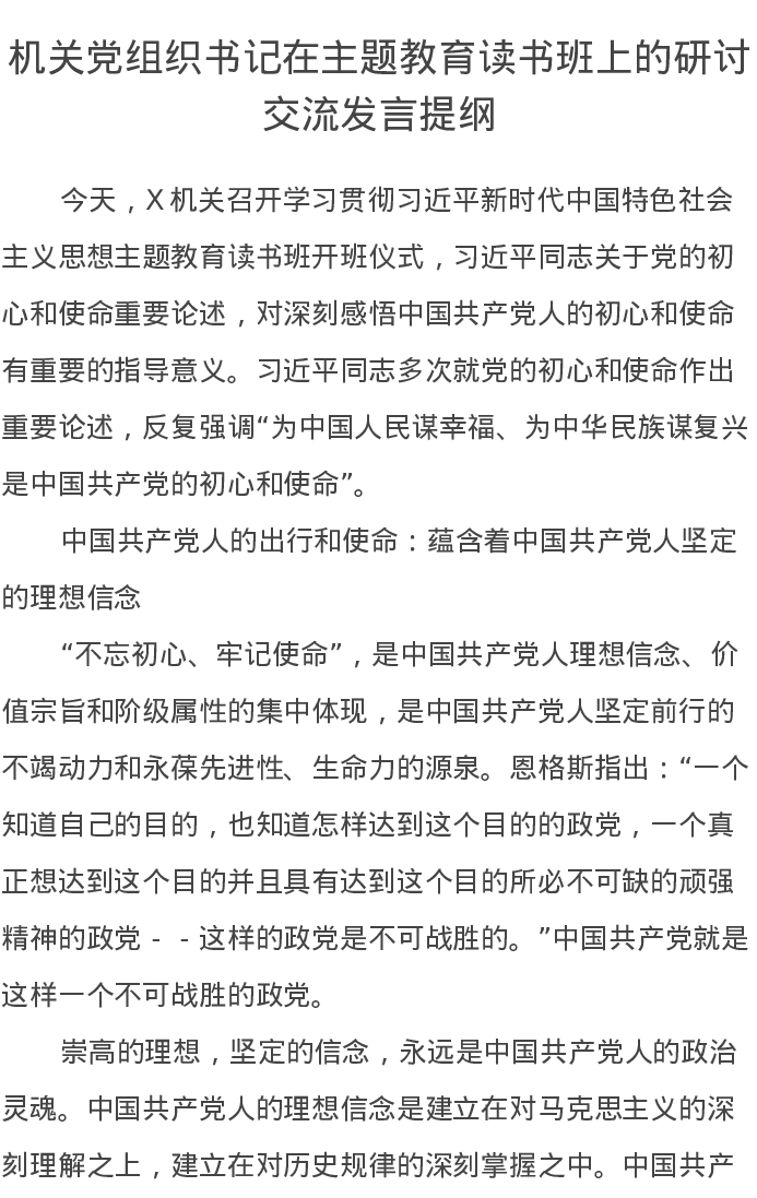 机关党组织书记在主题教育读书班上的研讨交流发言提纲(特色社会主义思想)