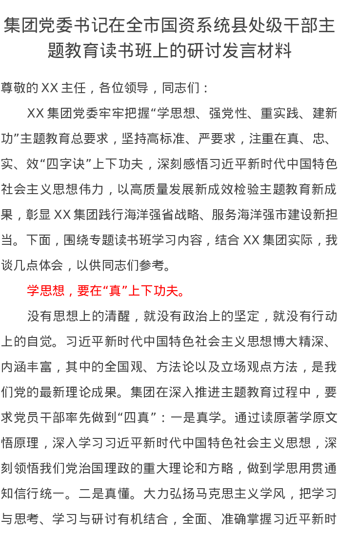 集团党委书记在全市国资系统县处级干部主题教育读书班上的研讨发言材料(特色社会主义思想)