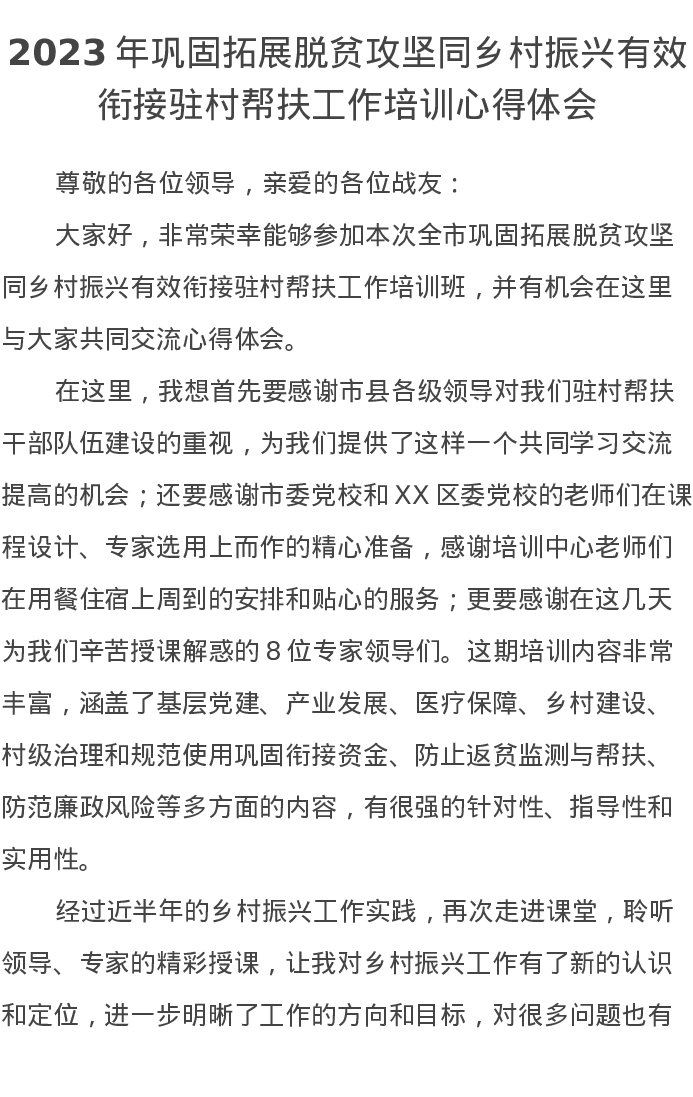2023年巩固拓展脱贫攻坚同乡村振兴有效衔接驻村帮扶工作培训心得体会