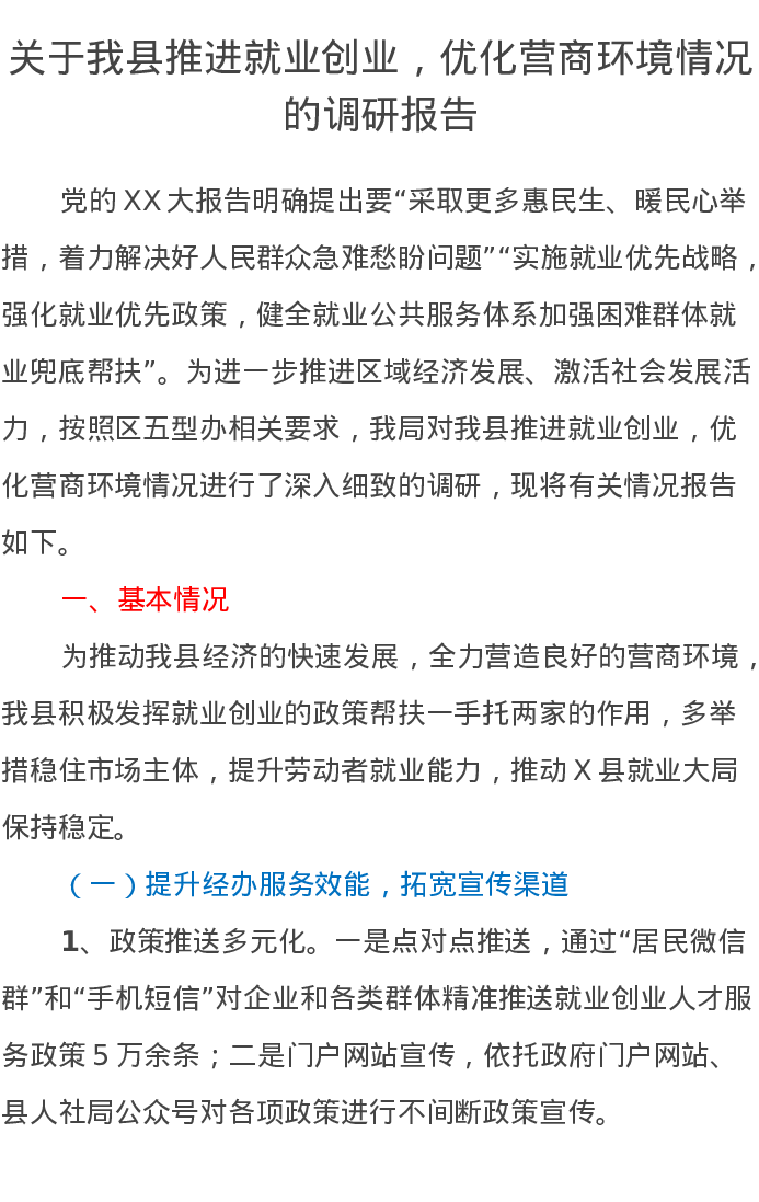 关于我县推进就业创业,优化营商环境情况的调研报告
