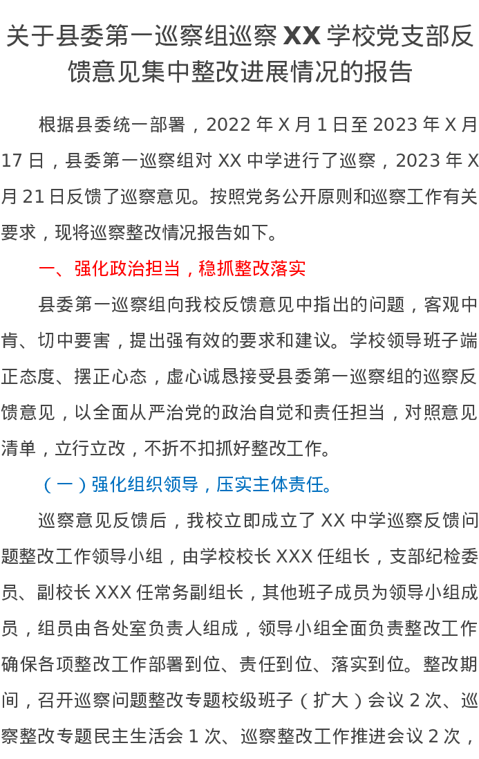 关于县委第一巡察组巡察XX学校党支部反馈意见集中整改进展情况的报告