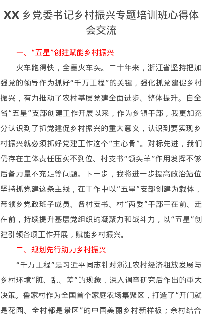XX乡党委书记乡村振兴专题培训班心得体会交流