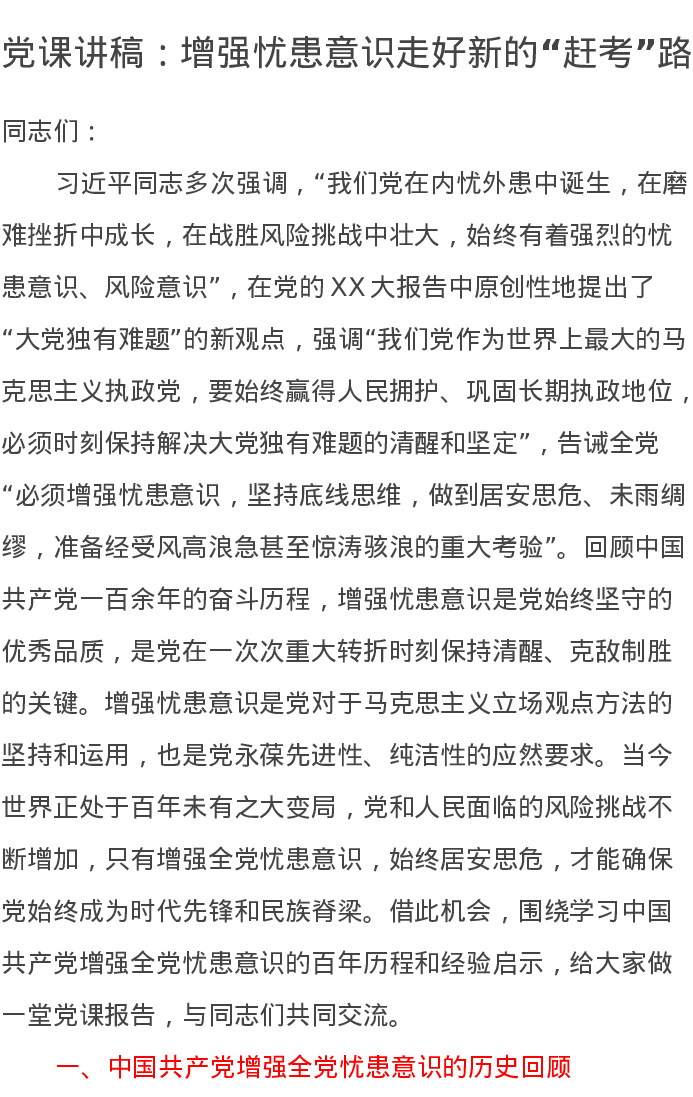 党课讲稿:增强忧患意识走好新的“赶考”路