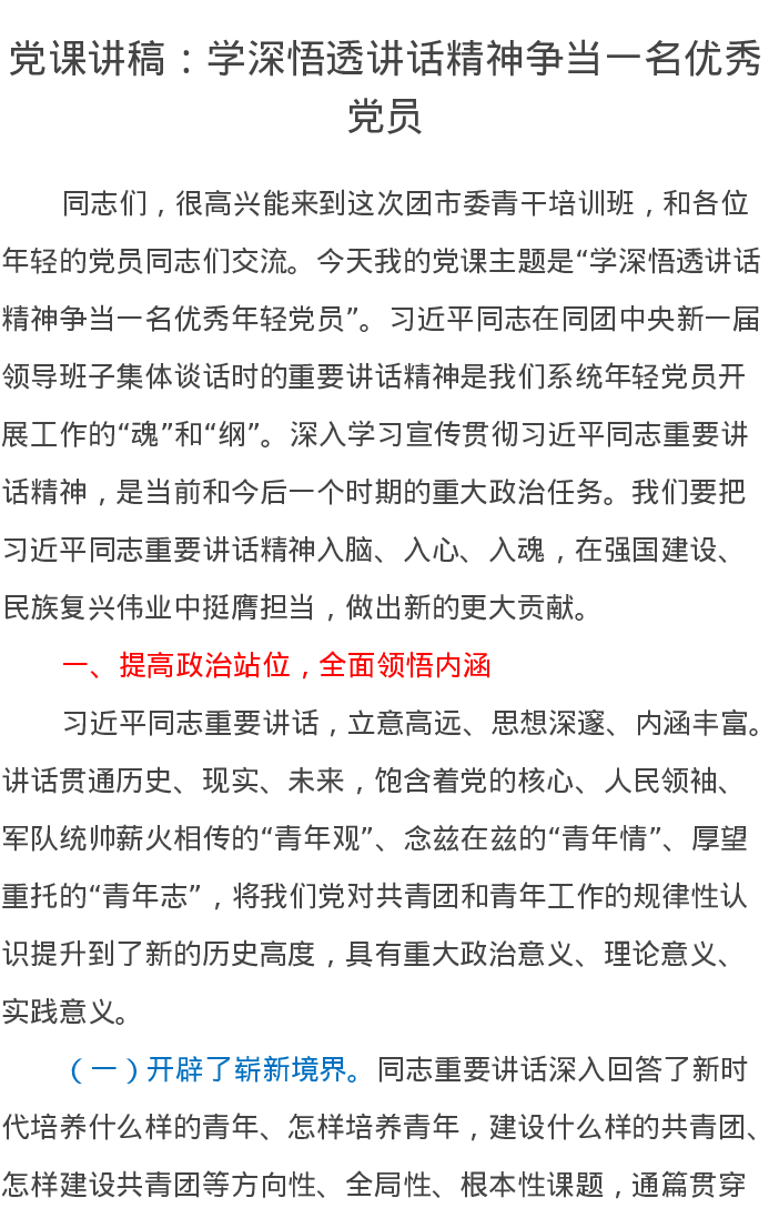 党课讲稿:学深悟透讲话精神争当一名优秀党员