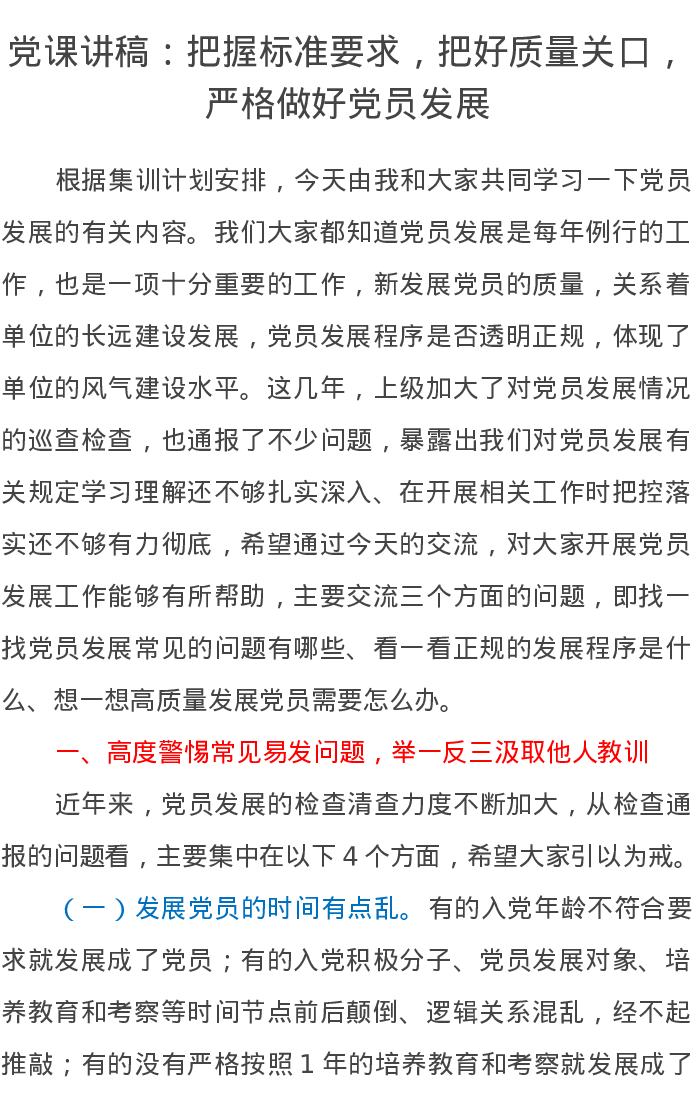 党课讲稿:把握标准要求,把好质量关口,严格做好党员发展