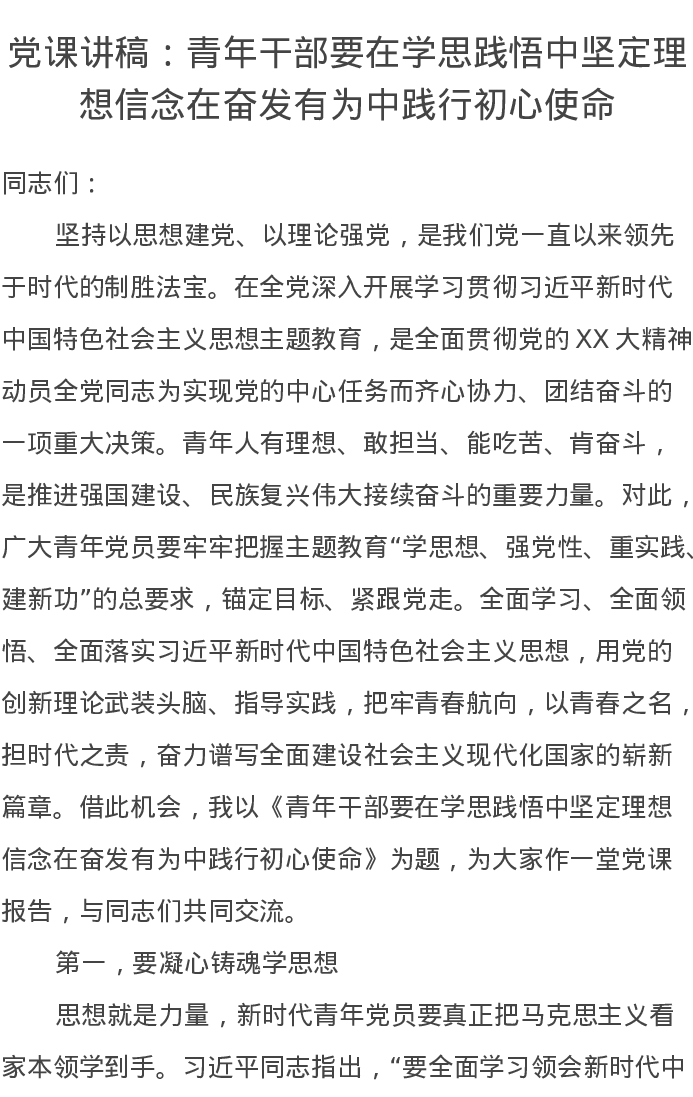 党课讲稿:青年干部要在学思践悟中坚定理想信念在奋发有为中践行初心使命