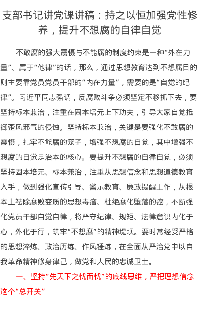 支部书记讲党课讲稿:持之以恒加强党性修养,提升不想腐的自律自觉
