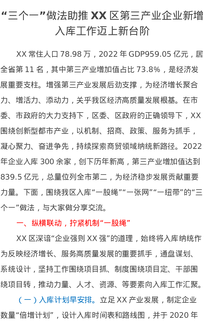 “三个一”做法助推XX区第三产业企业新增入库工作迈上新台阶汇报