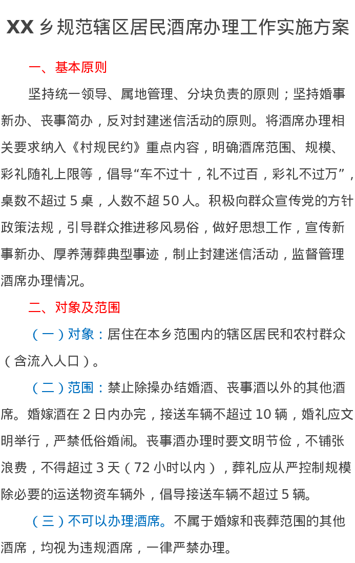 XX乡规范辖区居民酒席办理工作实施方案