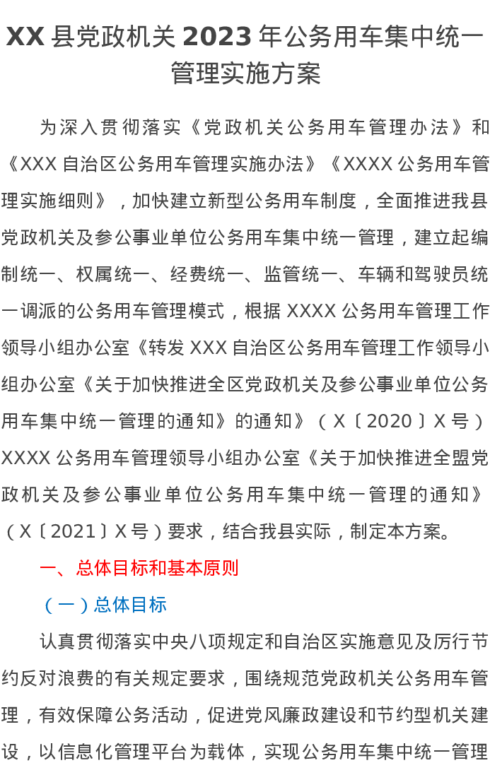 XX县党政机关2023年公务用车集中统一管理实施方案