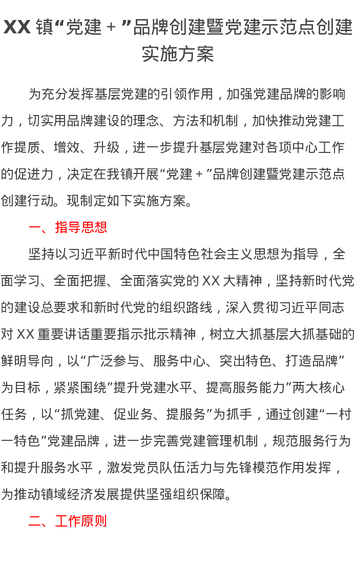 XX镇“党建+”品牌创建暨党建示范点创建实施方案