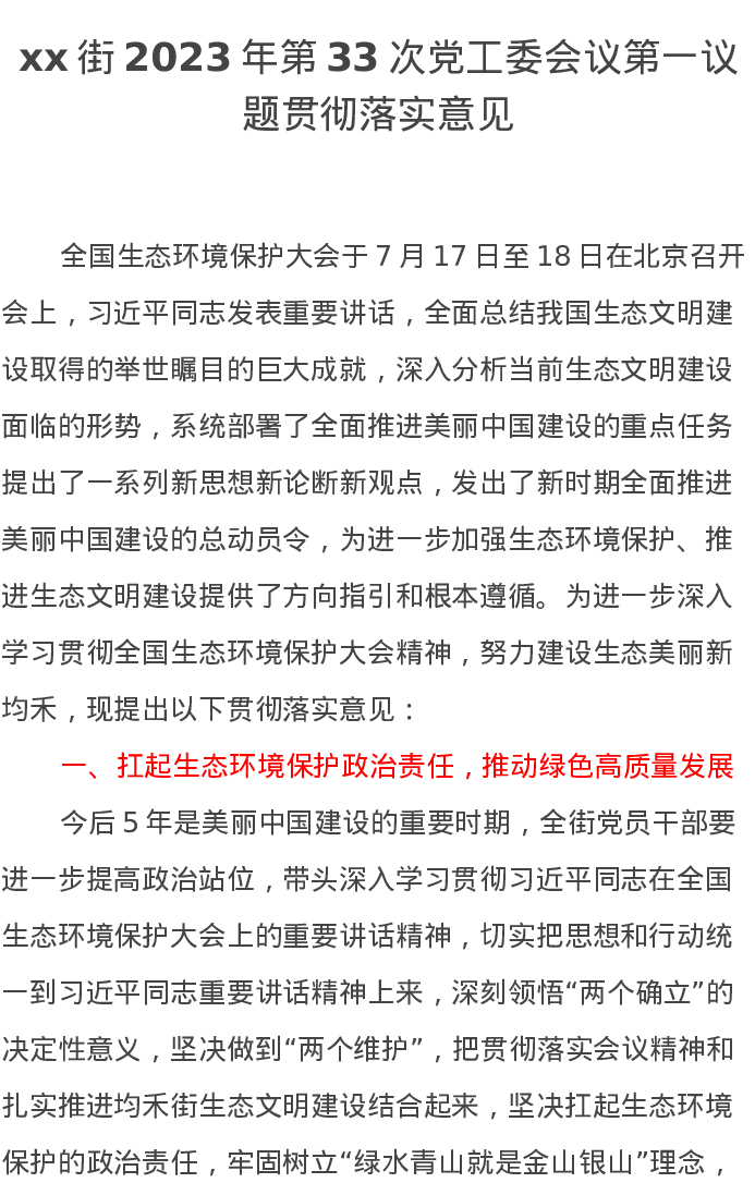 xx街2023年第33次党工委会议第一议题贯彻落实意见