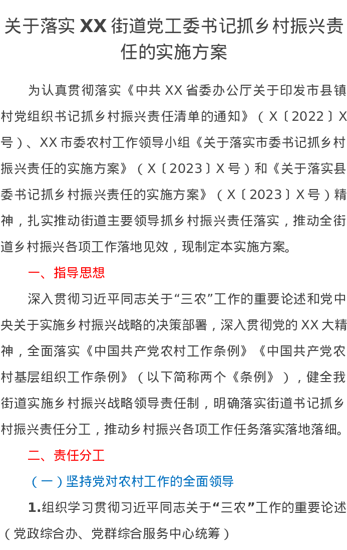 关于落实XX街道党工委书记抓乡村振兴责任的实施方案