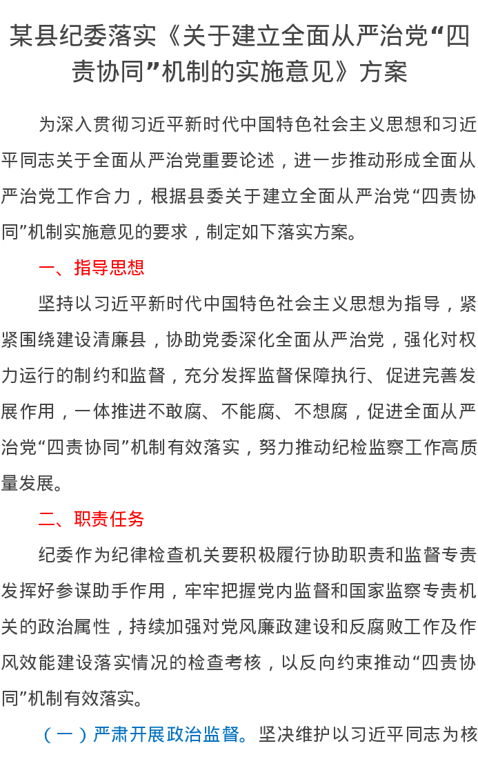 某县纪委落实《关于建立全面从严治党“四责协同”机制的实施意见》方案