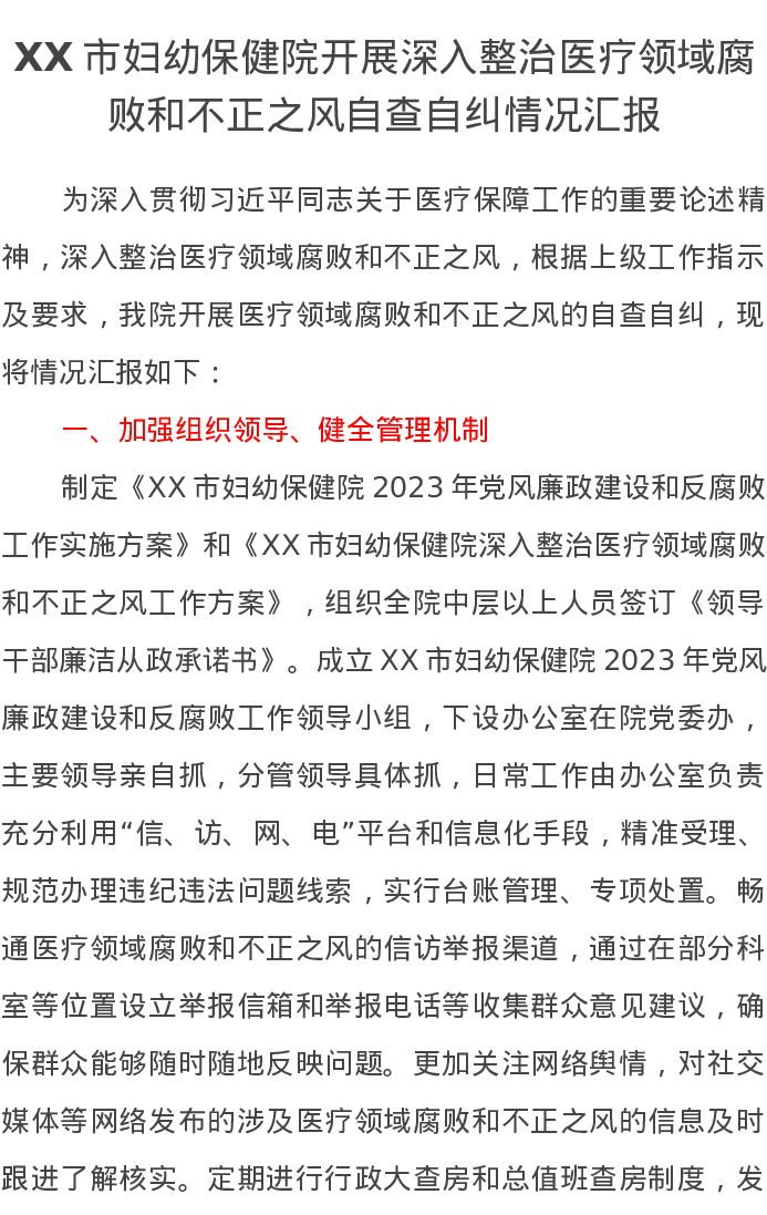 XX市妇幼保健院开展深入整治医疗领域腐败和不正之风自查自纠情况汇报