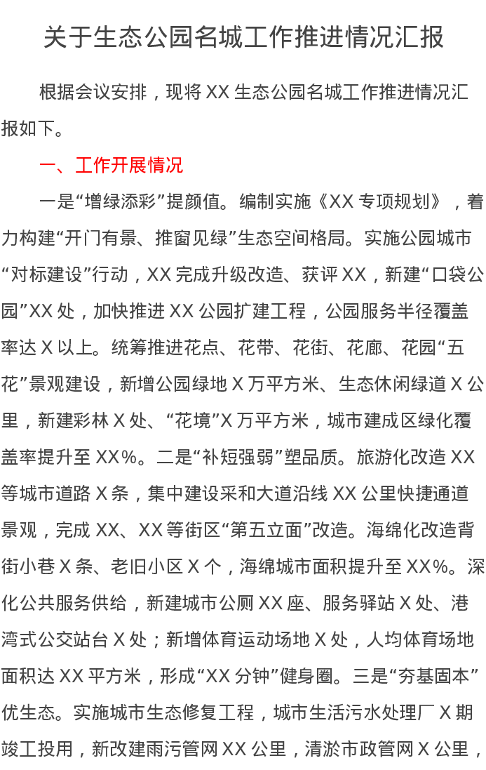 关于生态公园名城工作推进情况汇报