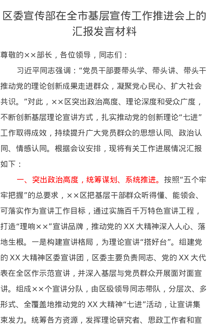 区委宣传部在全市基层宣传工作推进会上的汇报发言材料