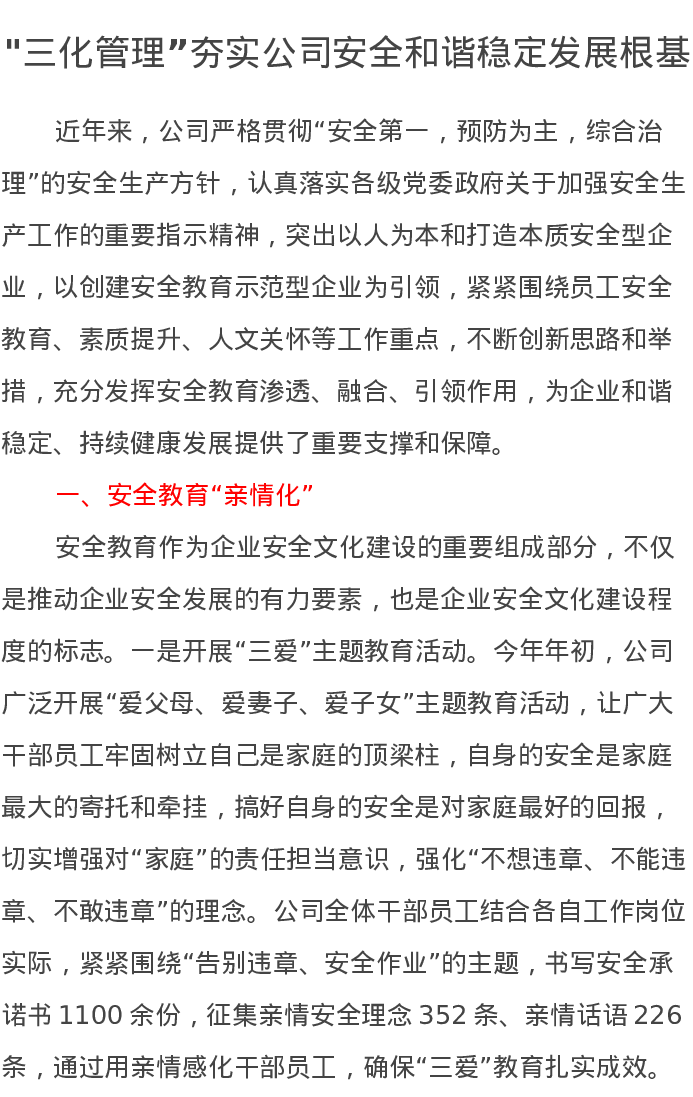 工作汇报:三化管理”夯实公司安全和谐稳定发展根基