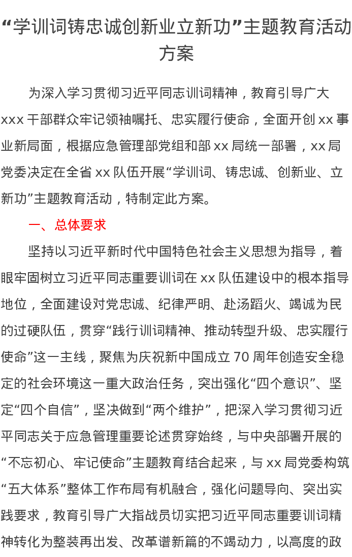 “学训词铸忠诚创新业立新功”主题教育活动方案(特色社会主义思想)