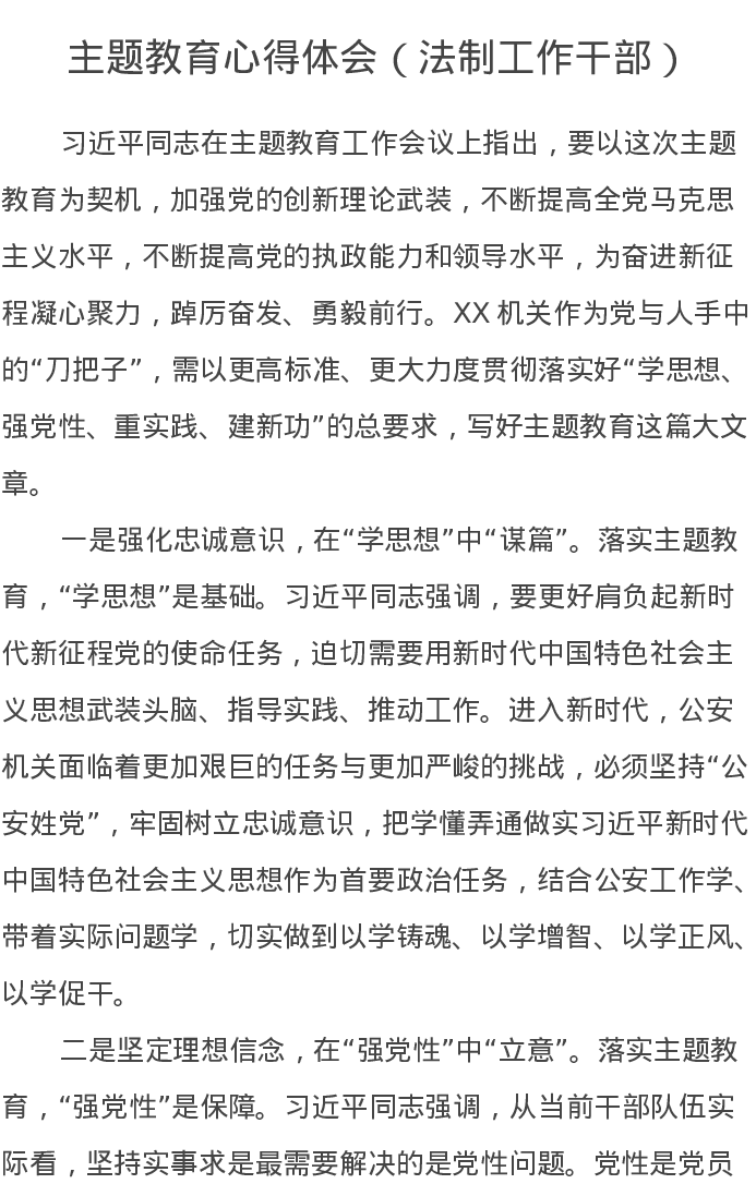 主题教育心得体会(法制工作干部)特色社会主义思想