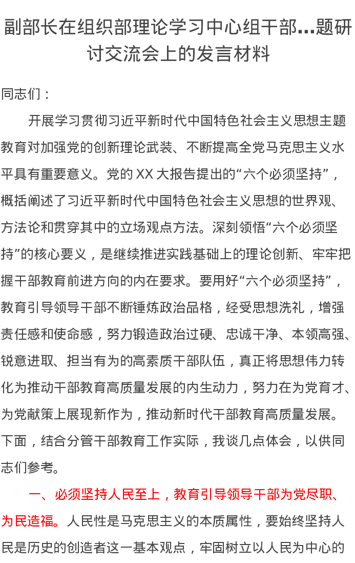 副部长在组织部理论学习中心组干部主题教育研讨交流会上的发言材料(特色社会主义思想)