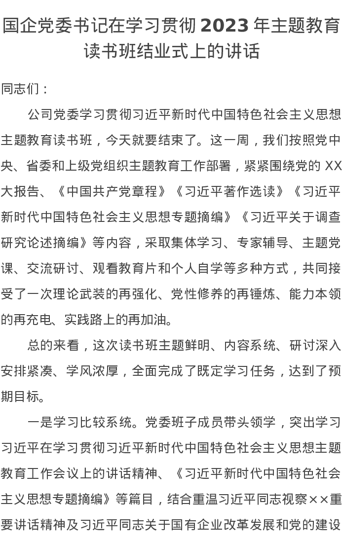 国企党委书记在学习贯彻2023年主题教育读书班结业式上的讲话(特色社会主义思想)