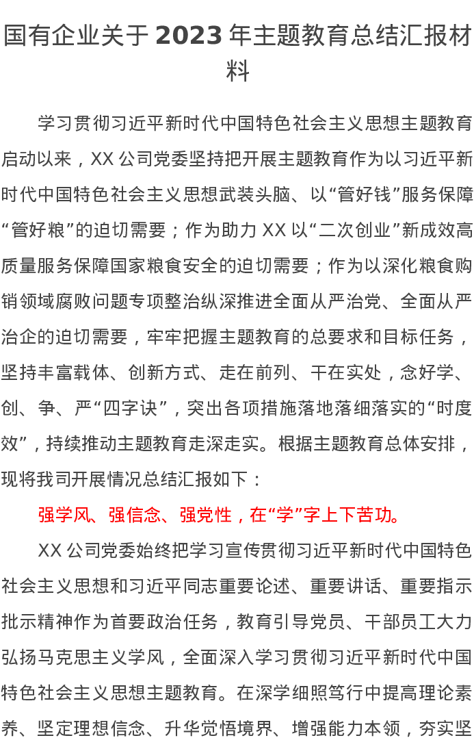 国有企业关于2023年主题教育总结汇报材料(特色社会主义思想)