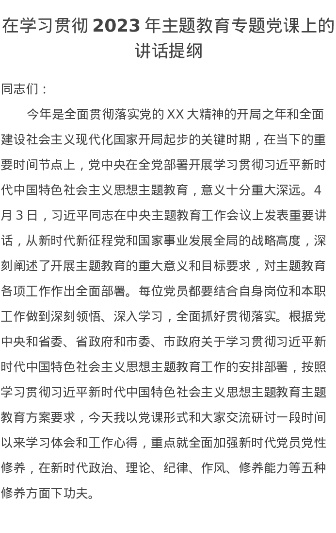 在学习贯彻2023年主题教育专题党课上的讲话提纲(特色社会主义思想)