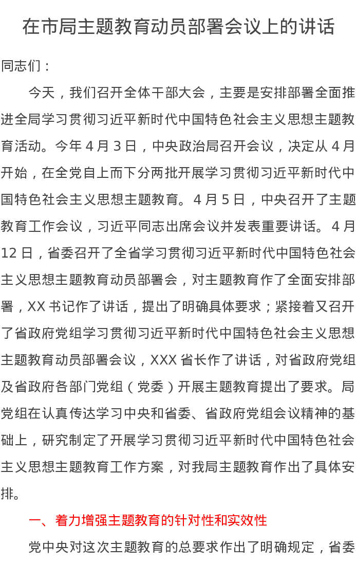 在市局主题教育动员部署会议上的讲话(特色社会主义思想)