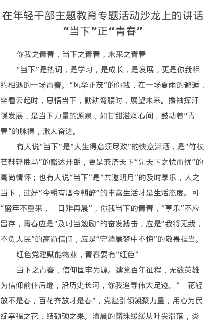 在年轻干部主题教育专题活动沙龙上的讲话:“当下”正“青春”(特色社会主义思想)