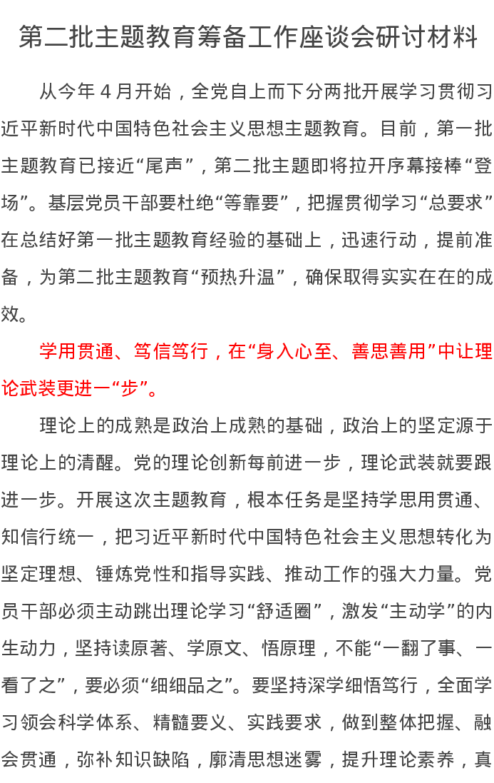 第二批主题教育筹备工作座谈会研讨材料(特色社会主义思想)