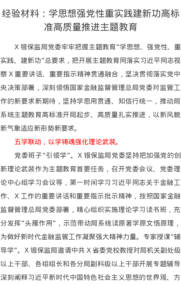 经验材料:学思想强党性重实践建新功高标准高质量推进主题教育(特色社会主义思想)