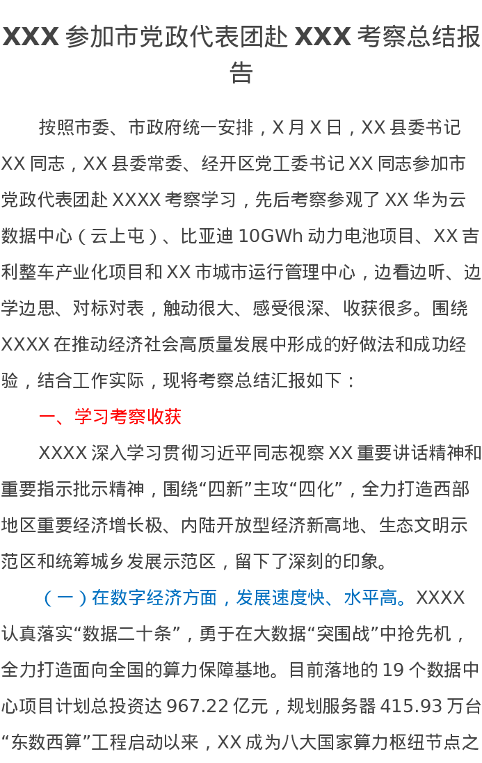 XXX参加市党政代表团赴XXX考察总结报告
