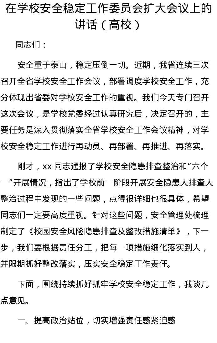 在学校安全稳定工作委员会扩大会议上的讲话(高校)