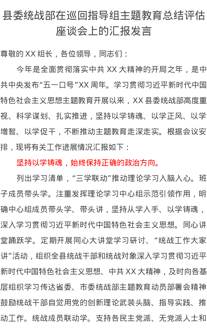 县委统战部在巡回指导组主题教育总结评估座谈会上的汇报发言(特色社会主义思想)