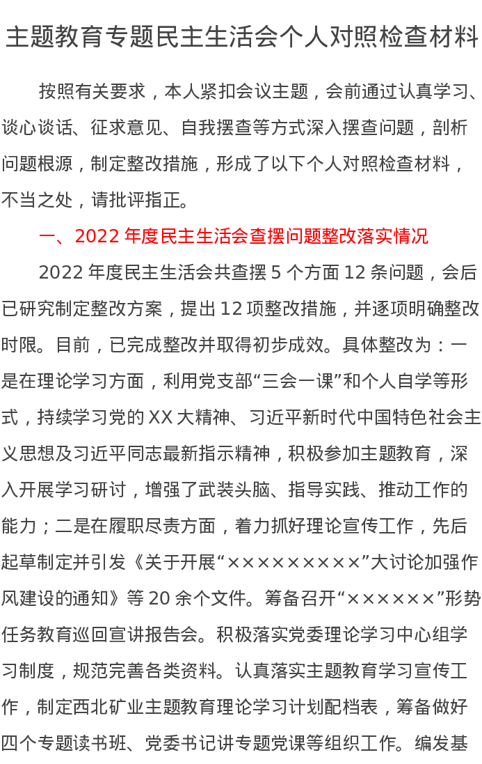 主题教育专题民主生活会个人对照检查材料(六个方面特色社会主义思想)