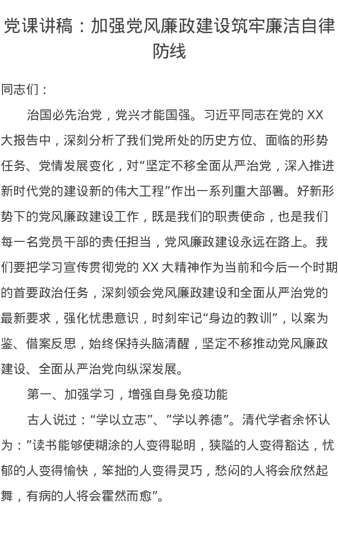 党课讲稿:加强党风廉政建设筑牢廉洁自律防线