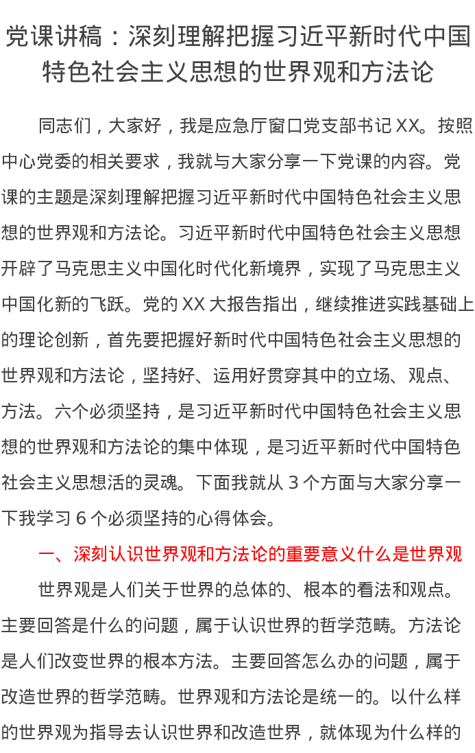 党课讲稿:深刻理解把握习近平新时代中国特色社会主义思想的世界观和方法论