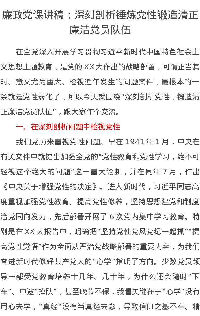 廉政党课讲稿:深刻剖析锤炼党性锻造清正廉洁党员队伍
