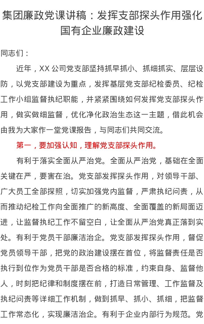 集团廉政党课讲稿:发挥支部探头作用强化国有企业廉政建设