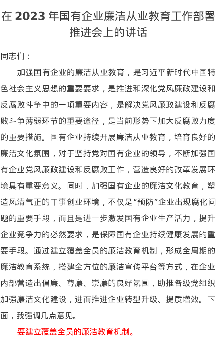 在2023年国有企业廉洁从业教育工作部署推进会上的讲话