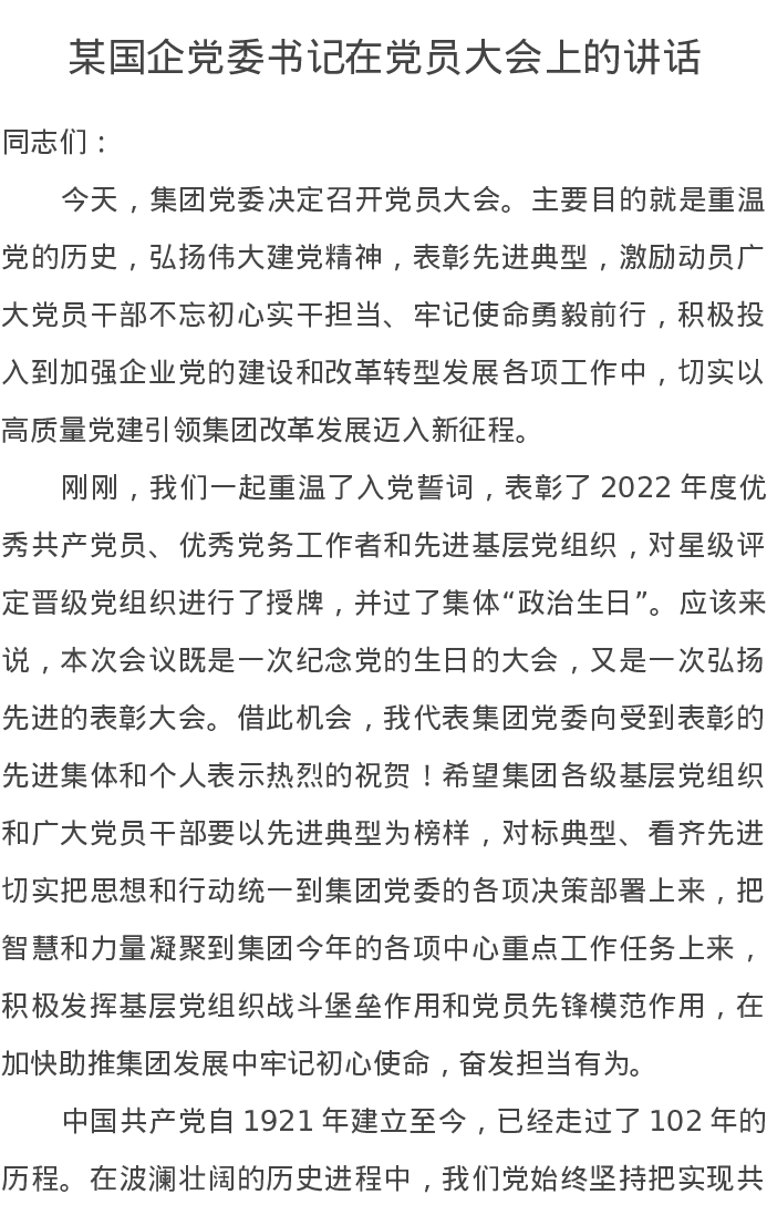 某国企党委书记在党员大会上的讲话