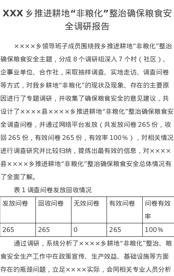 XXX乡推进耕地“非粮化”整治确保粮食安全调研报告