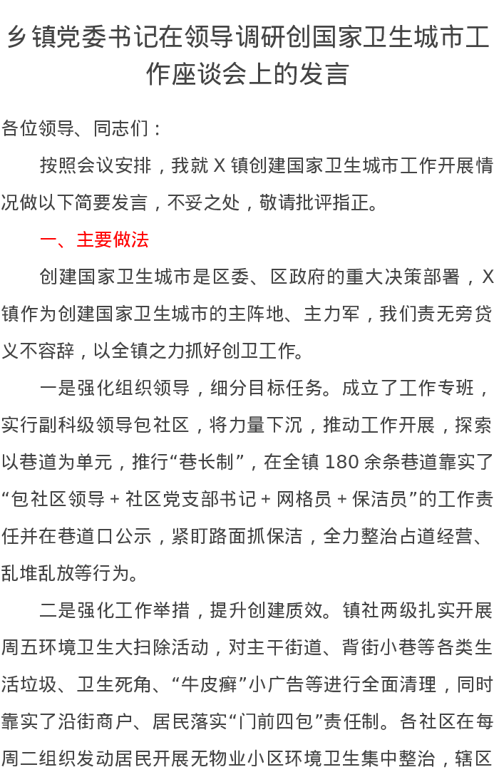 乡镇党委书记在领导调研创国家卫生城市工作座谈会上的发言