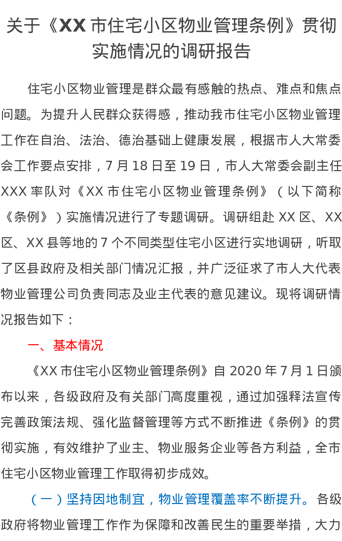 关于《XX市住宅小区物业管理条例》贯彻实施情况的调研报告