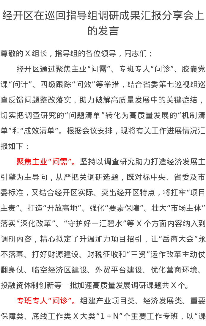 经开区在巡回指导组调研成果汇报分享会上的发言