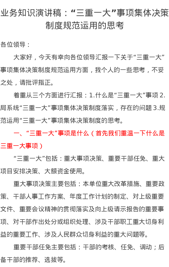 业务知识演讲稿:“三重一大”事项集体决策制度规范运用的思考