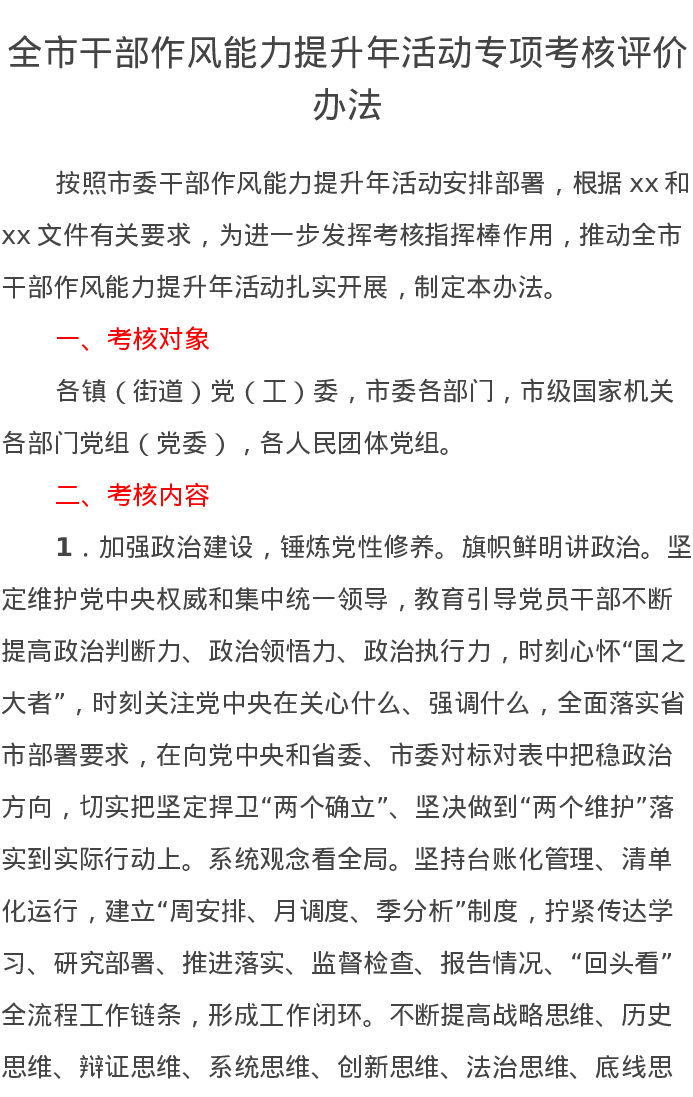 全市干部作风能力提升年活动专项考核评价办法