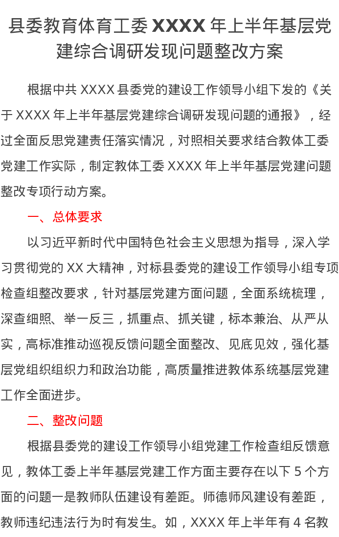县委教育体育工委XXXX年上半年基层党建综合调研发现问题整改方案