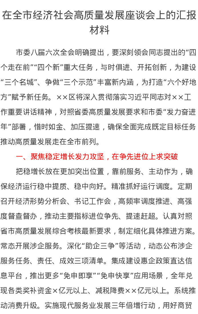 在全市经济社会高质量发展座谈会上的汇报材料
